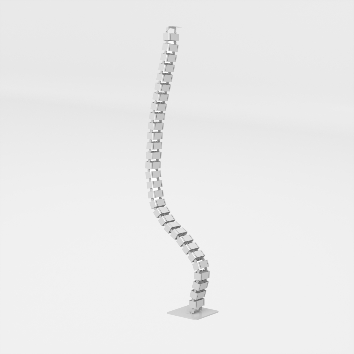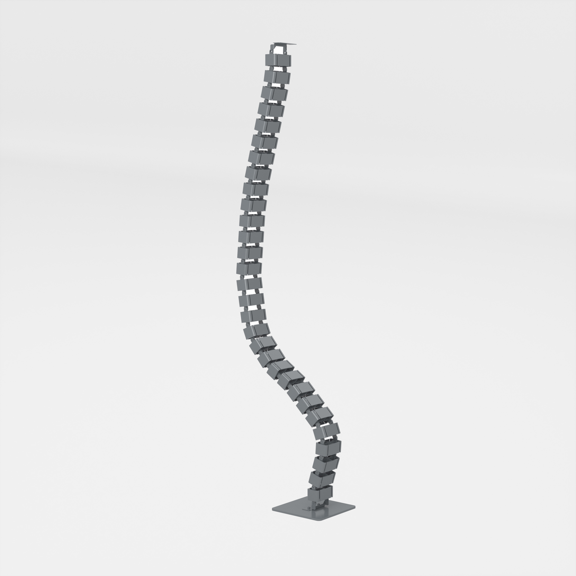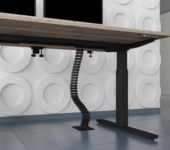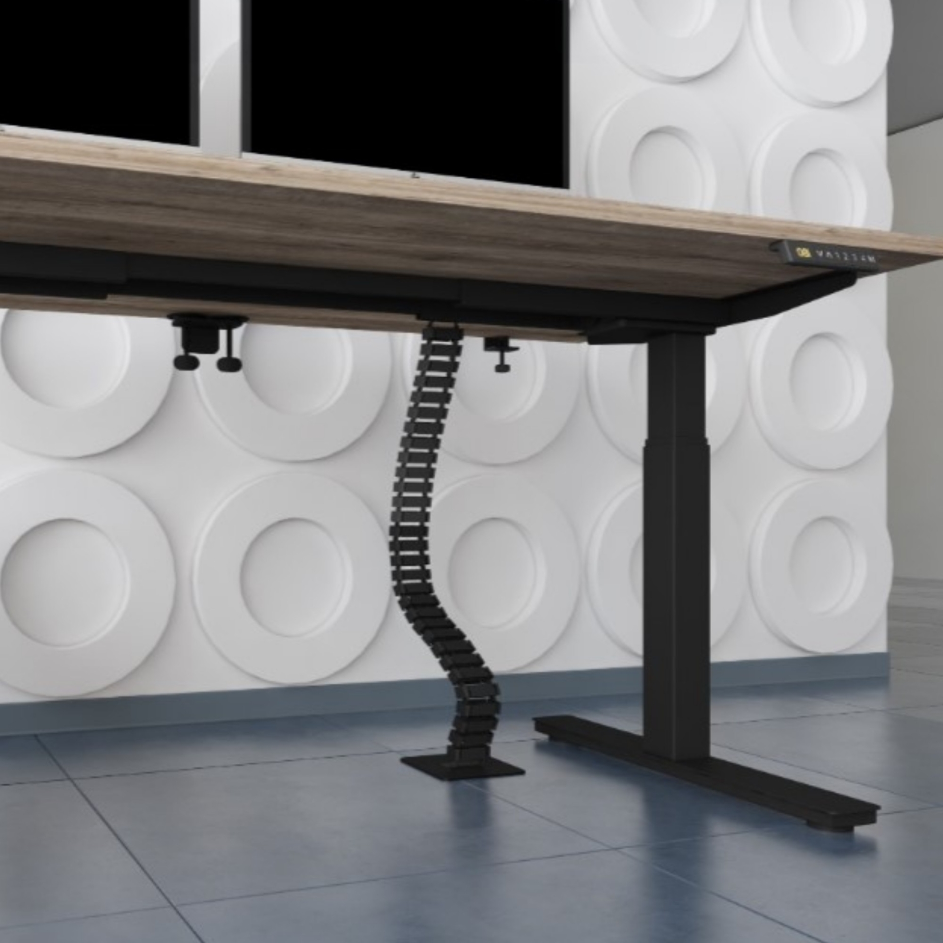 To rozwiązanie stworzone z myślą o biurkach regulowanych — elastyczna konstrukcja porusza się wraz z biurkiem, a stalowa płytka w dolnej części zapewnia odpowiednie obciążenie, stabilność i chroni prowadnicę przed szuraniem po podłodze podczas podnoszenia lub opuszczania blatu.