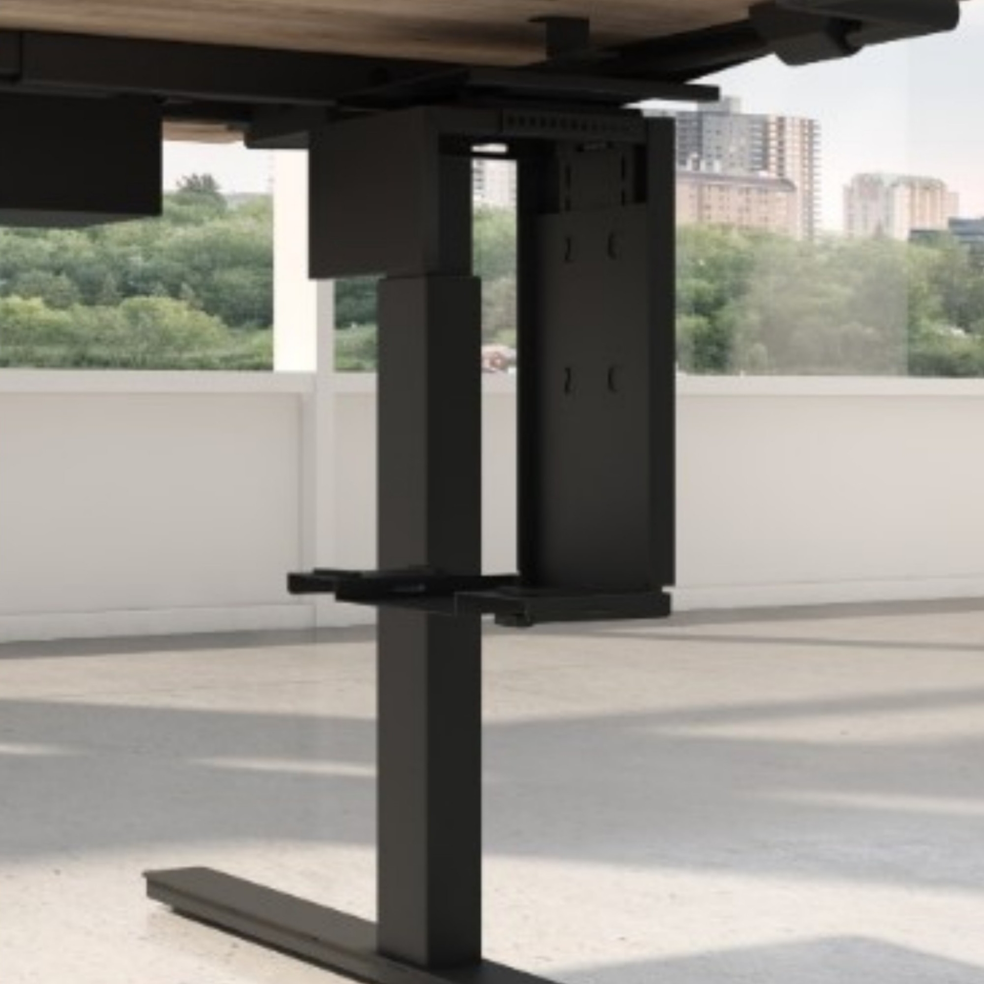 - Porządek i ergonomia – przewody nie naciągają się podczas regulacji biurka, komputer nie przeszkadza w sprzątaniu.