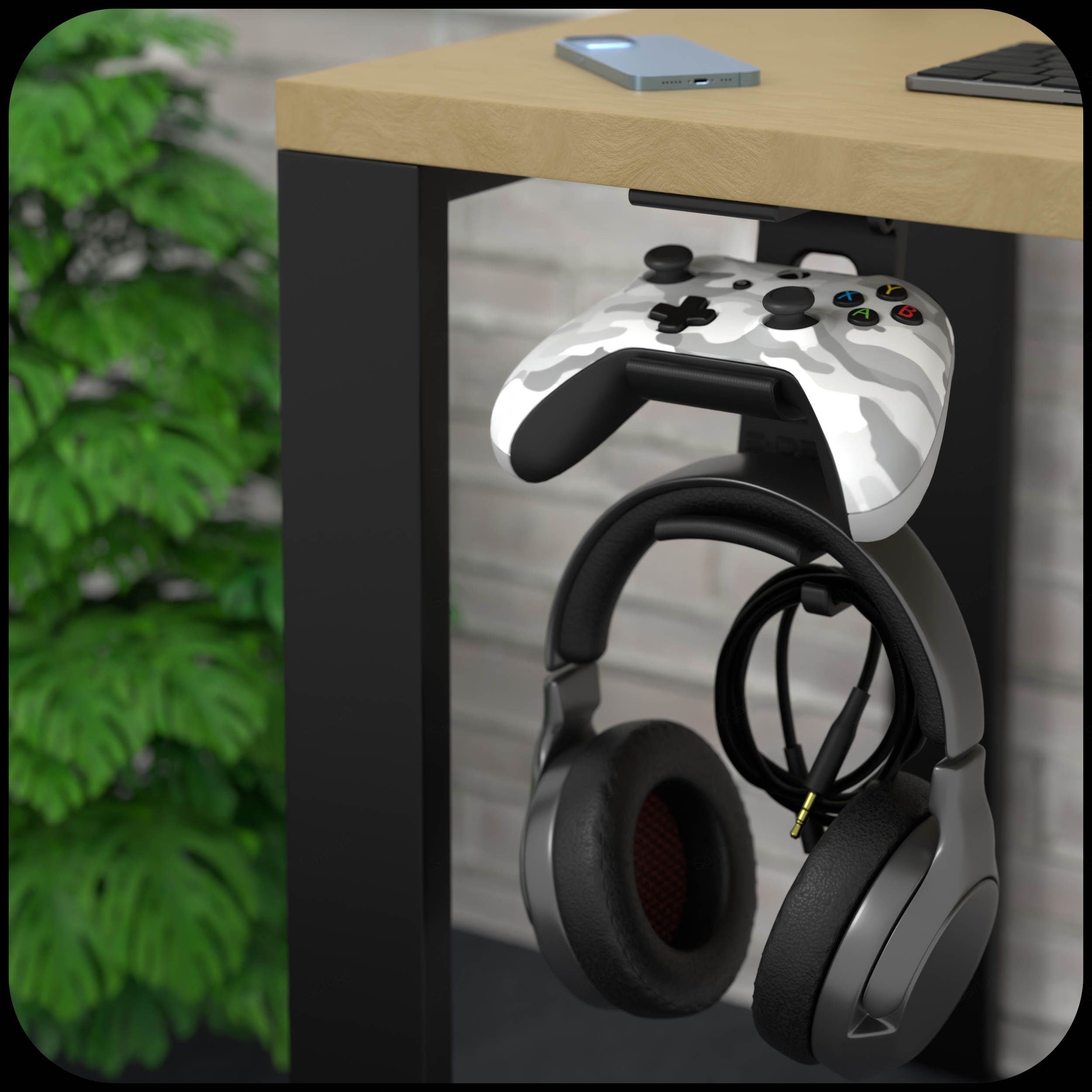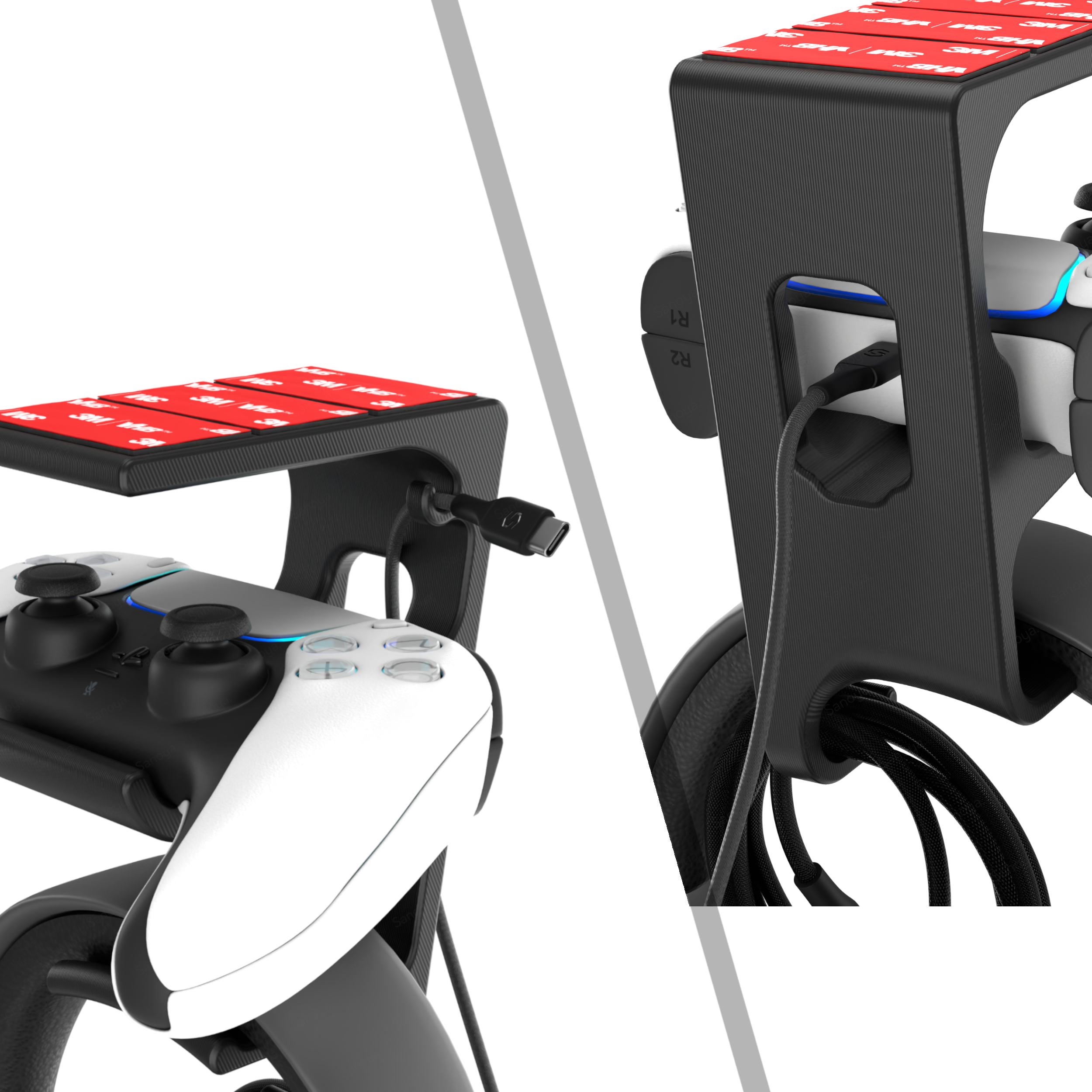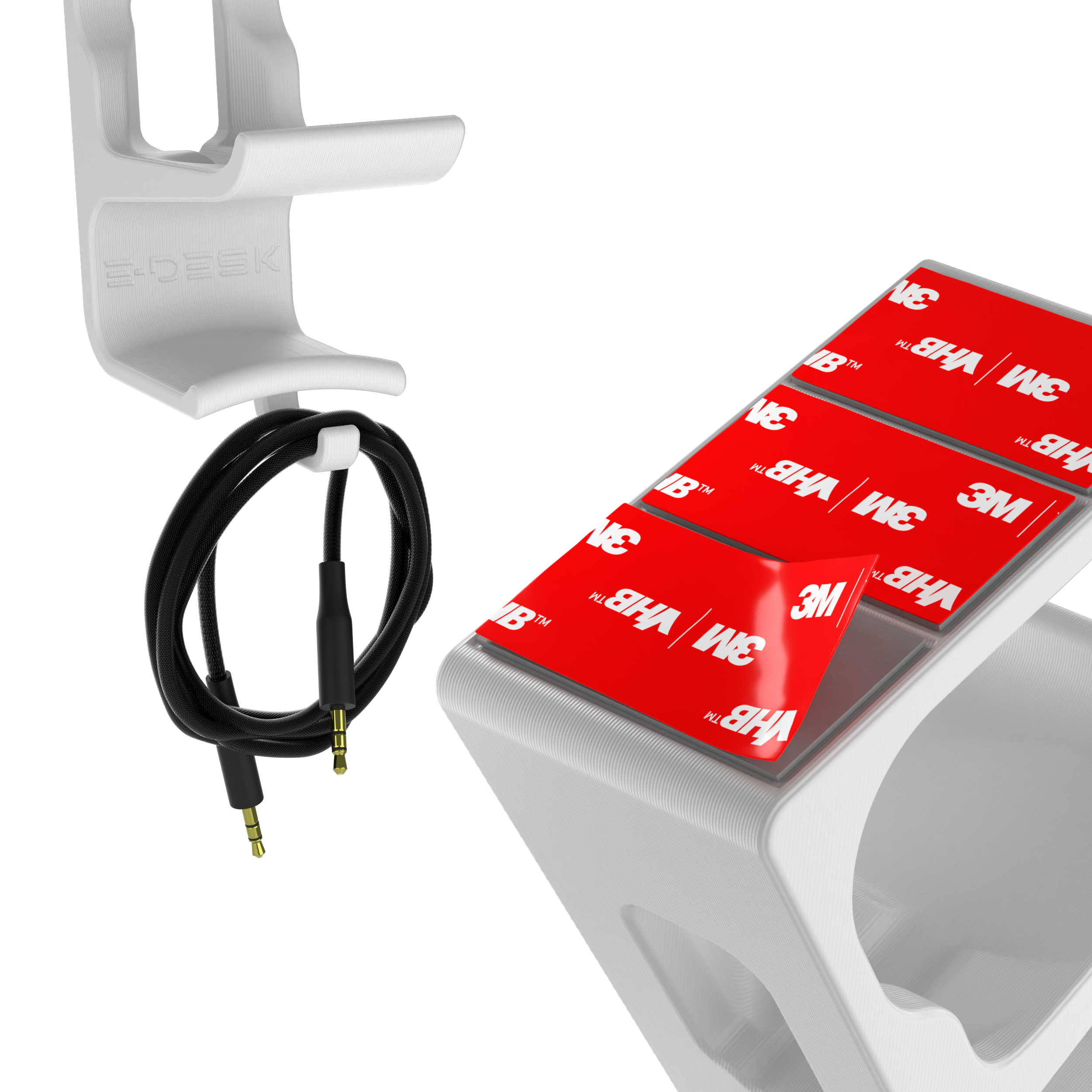 Jego przemyślana forma umożliwia stabilne podtrzymanie jednocześnie słuchawek i kontrolera. Wbudowany wieszak na kable eliminuje plątaninę przewodów i pomaga zachować porządek na biurku.